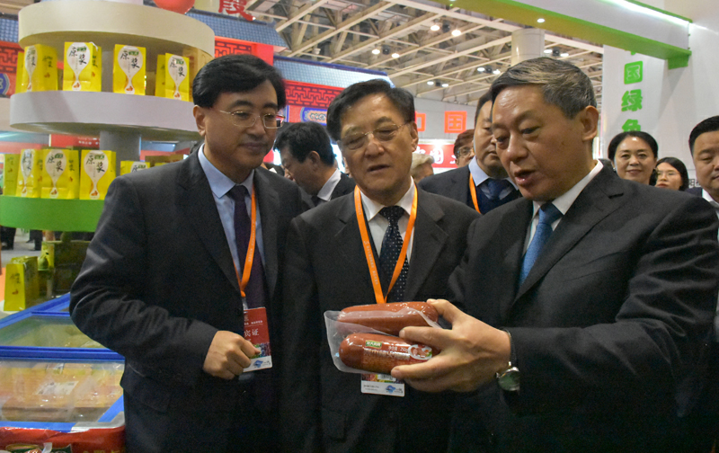 烟台市委书记张术平(右一)向客商介绍龙大产品