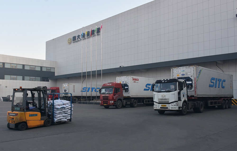 12月21日,龙大集团仓储库前,冷链集装箱车一字排开,多部叉车在货台上往来穿梭,劳动场面热烈而井然。据集团海外事业部工作人员介绍,今天共发45个货柜、667吨冷冻食品。4天后,这些食品将飘洋过海到达日本东京港。