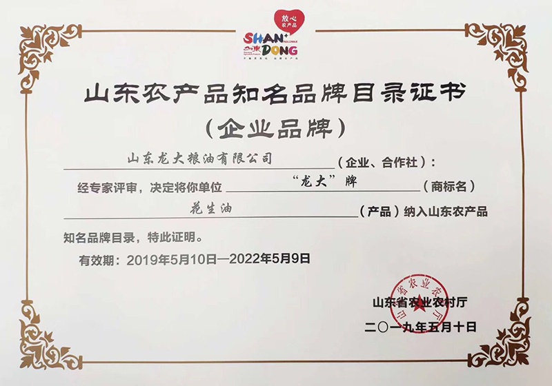 龙大花生油获评山东省第四批知名企业产品品牌