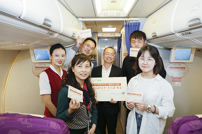 “只用当季新花生,低温蒸炒,不勾兑,不调香,头道初榨,地道原香。”美丽的工作人员正热情的向乘客们讲述着“如何分辨好的花生油”……