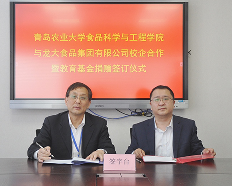 4月21日,龙大食品集团有限公司与青岛农业大学校企合作签约仪式在龙大集团总部举行。龙大集团总经理张德润、青岛农业大学食品科学与工程学院院长王宝作为双方代表在合作协议上签字。